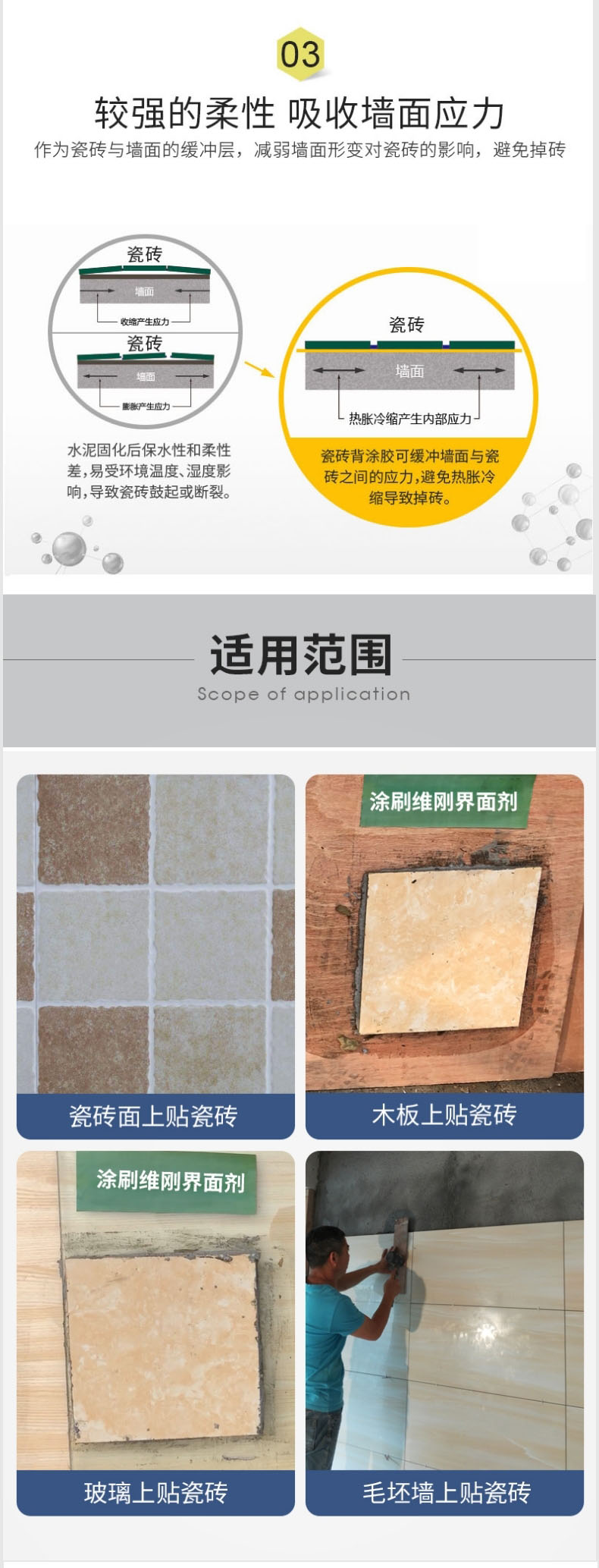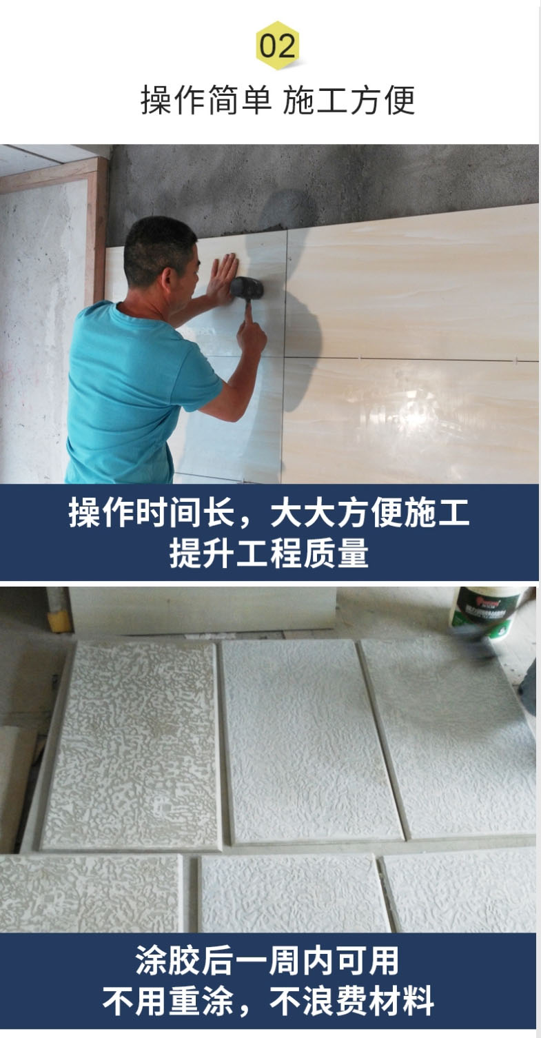 瓷砖背胶是应用于湿贴玻化砖的背面处理,有效提高玻化砖与粘结材料之间的粘结强度,解决玻化砖湿贴中常见的空鼓、脱落问题。