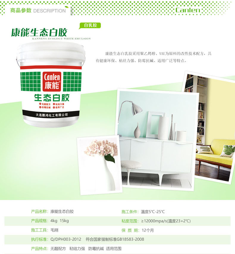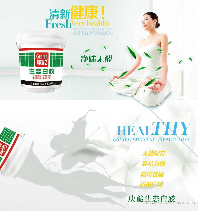 康能生态白乳胶采用聚乙烯醇、VAE为原料的改性技术配方,具有健康环保、粘结力强、防霉抗碱、适用广泛等特点。