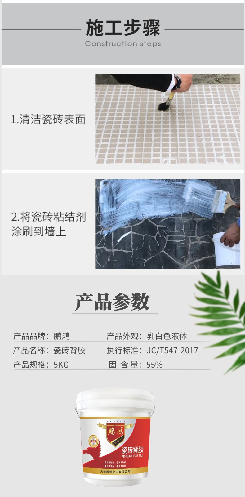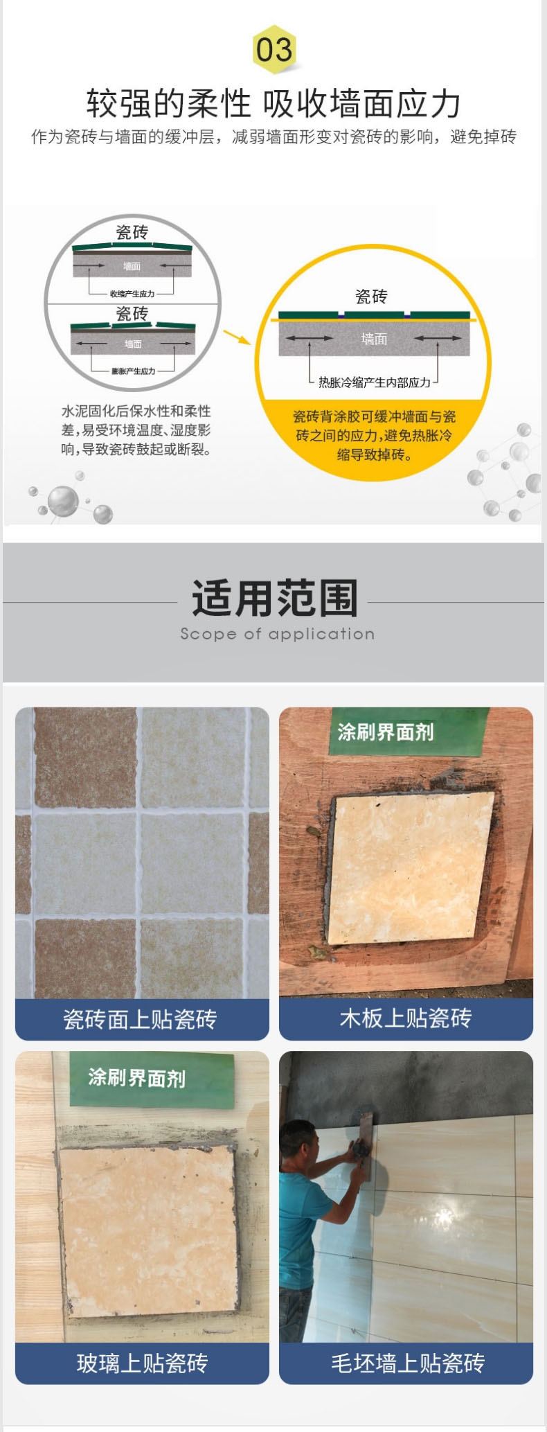 用于各类瓷砖铺贴中瓷砖背面处理;如玻璃化砖、仿古砖、文化砖、抛光砖、人造石、天然大理石、瓷片等。